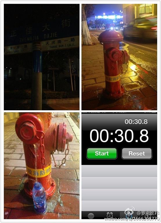 廣州正佳大街,有一臺消火栓,_近10天一直在漏水,無人問津,今晚用能裝600ml的空瓶算每一分鐘有多水不見了。裝滿這瓶子只需要30秒、等于每一分鐘有一升的水這樣流失。10天之內(nèi)有14400升的水悄悄的流失了。怎么沒人管?。?/div>